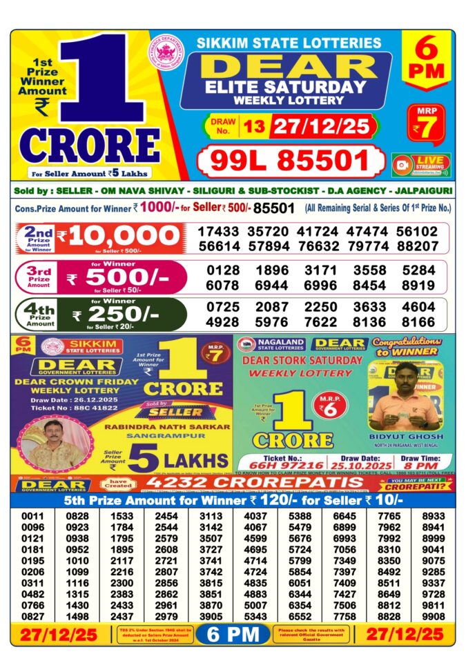 Dear Lottery 6PM Result For 27-12-25