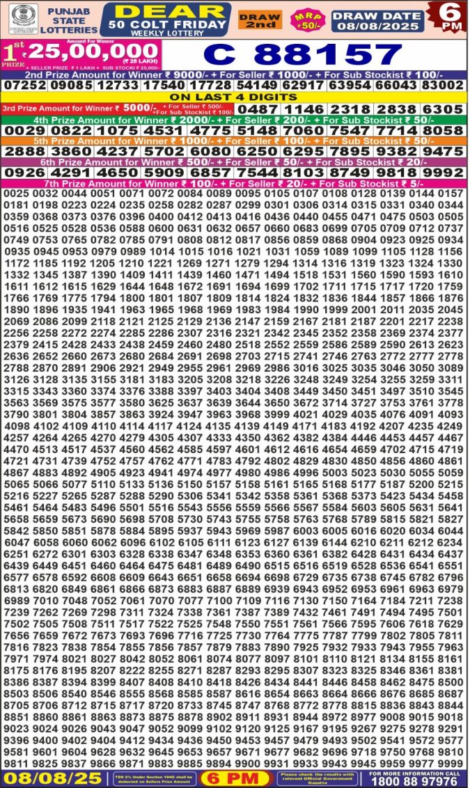 Lottery Sambad Result: Punjab State Dear 50 6 PM – 08/08/25 Leave a Comment on Lottery Sambad Result: Punjab State Dear 50 6 PM – 08/08/25