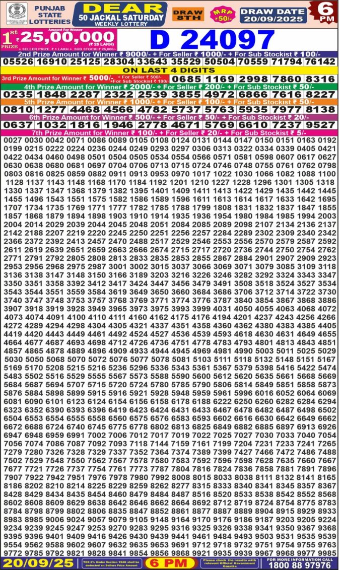 Lottery Sambad Result: Punjab State Dear 50 6 PM – 20/09/25 Leave a Comment on Lottery Sambad Result: Punjab State Dear 50 6 PM – 20/09/25