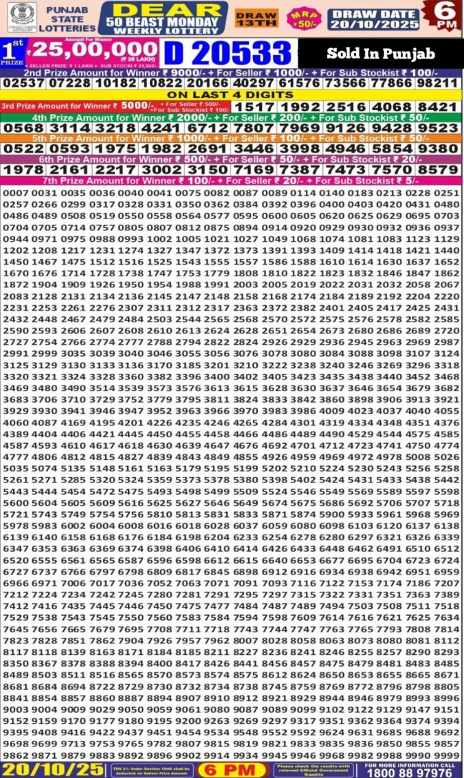 Lottery Sambad Result: Punjab State Dear 50 6 PM – 20/10/25 Leave a Comment on Lottery Sambad Result: Punjab State Dear 50 6 PM – 20/10/25