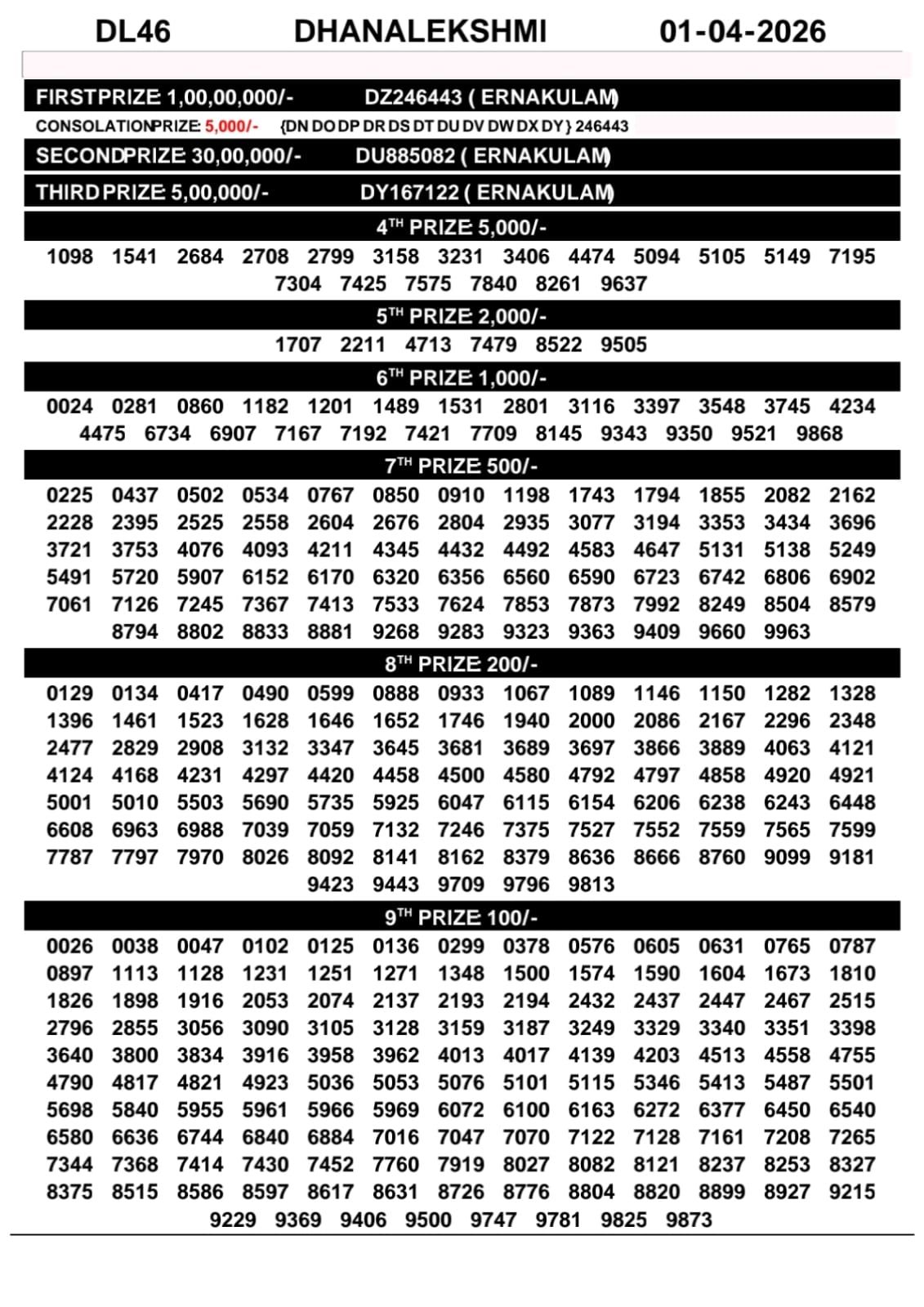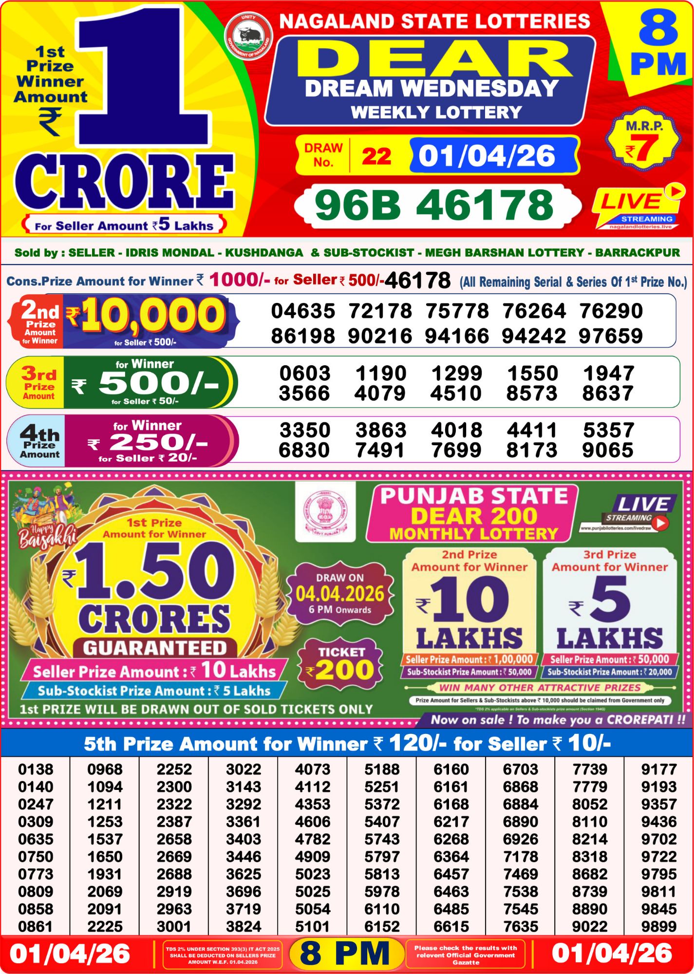 Dear Dream 8 PM Wednesday Weekly Lottery Result 01/04/2026 for Nagaland State Lottery