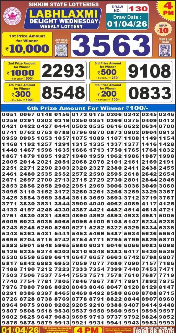 Dear Regal 6 PM Wednesday Weekly Lottery Result 01/04/2026 for Sikkim State Lottery