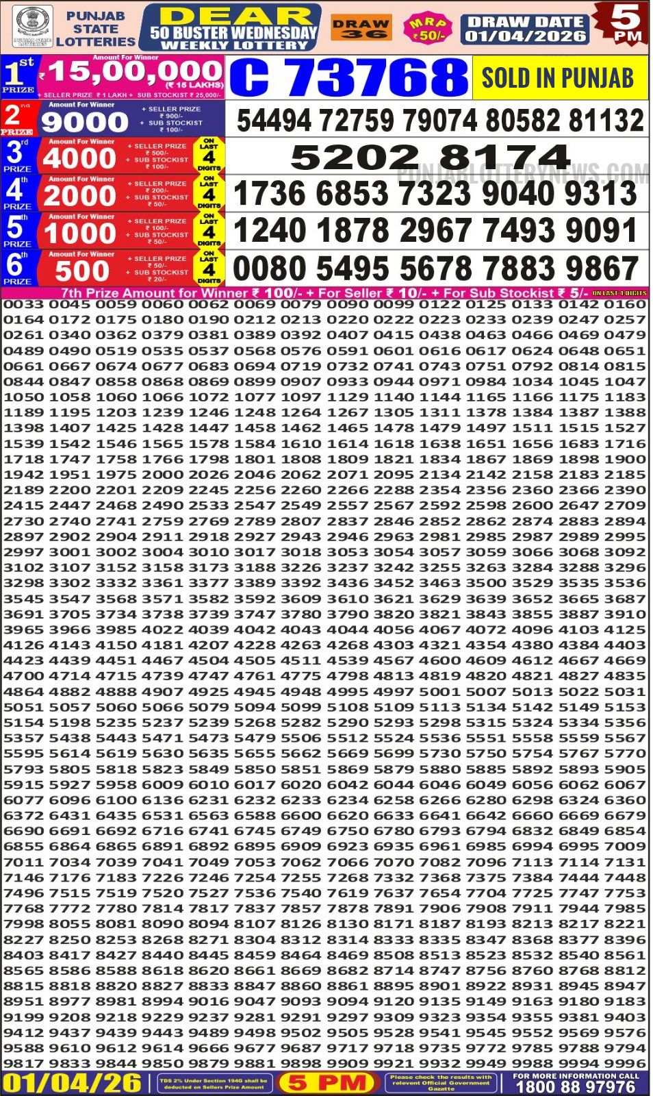 Punjab Dear 50 Buster Lottery Result Today – 5 PM