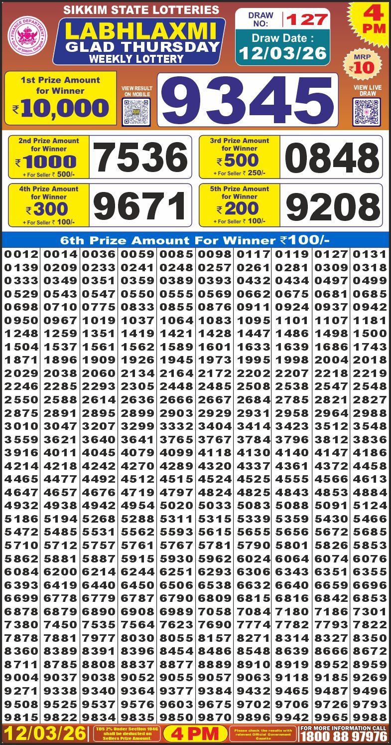 Dear Supreme 6 PM Thursday Weekly Lottery Result 12/03/2026 for Sikkim State Lottery