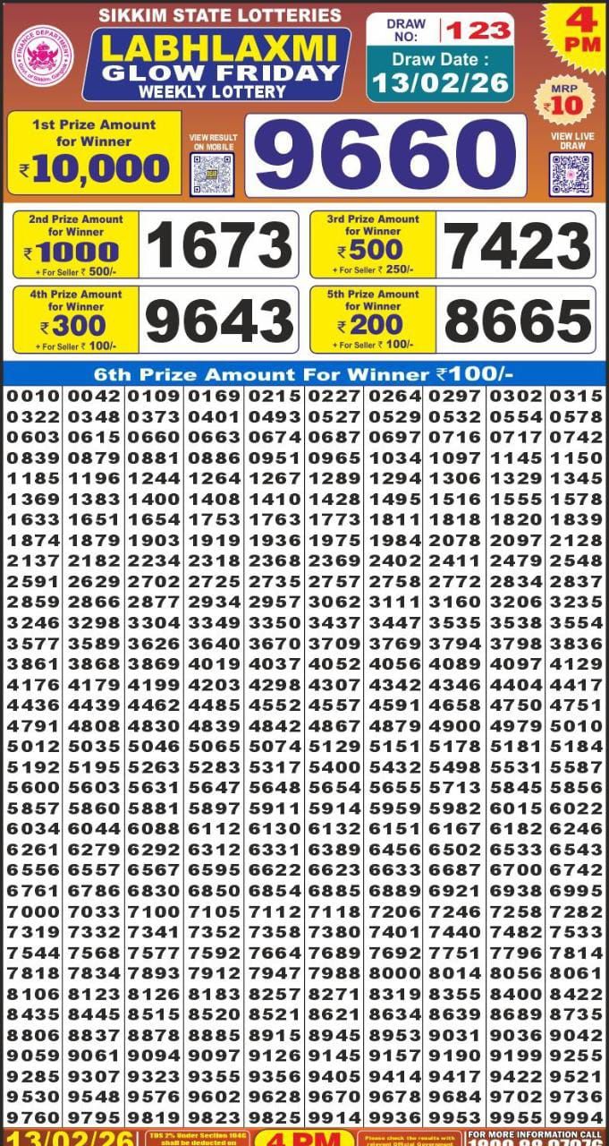 Dear Crown 6 PM Friday Weekly Lottery Result 13/02/2026 for Sikkim State Lottery