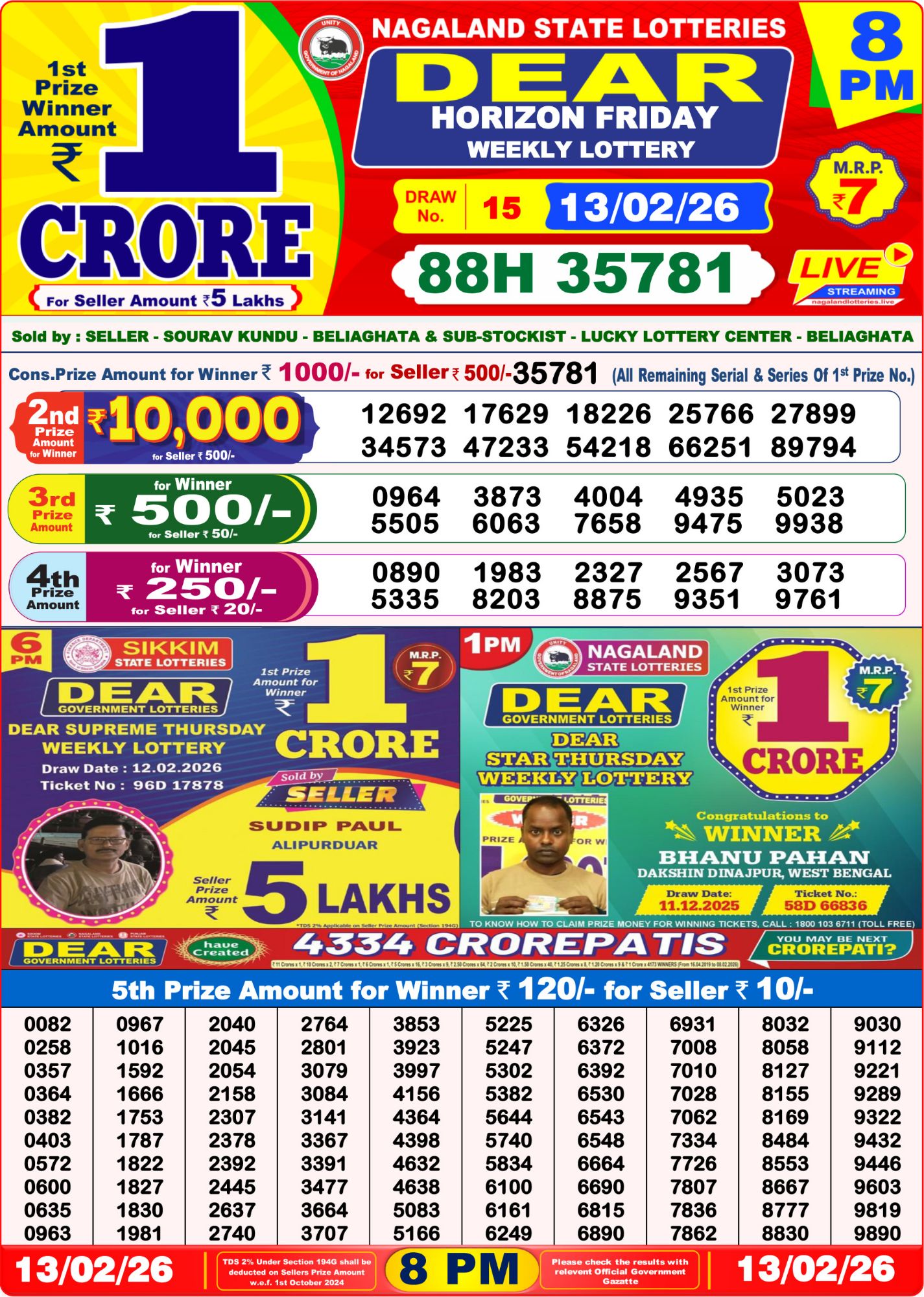 Dear Horizon 8 PM Friday Weekly Lottery Result 13/02/2026 for Nagaland State Lottery