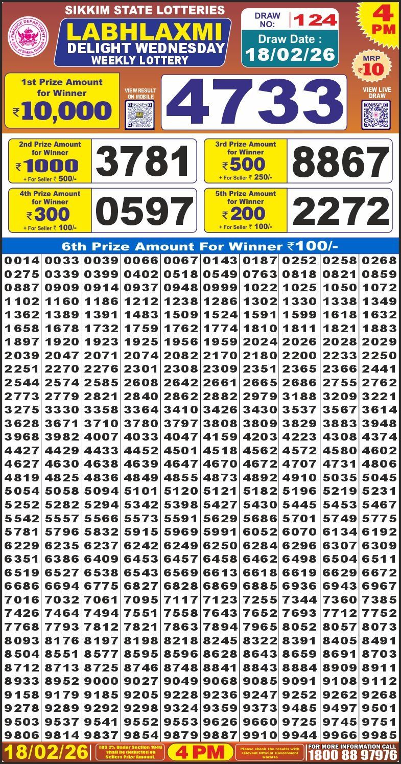 Dear Regal 6 PM Wednesday Weekly Lottery Result 18/02/2026 for Sikkim State Lottery