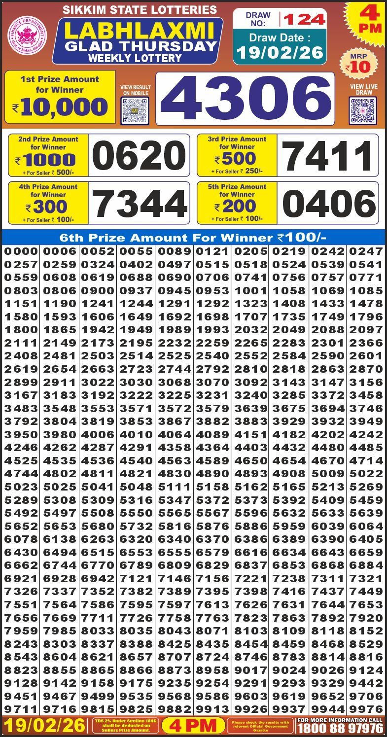 Dear Supreme 6 PM Thursday Weekly Lottery Result 19/02/2026 for Sikkim State Lottery
