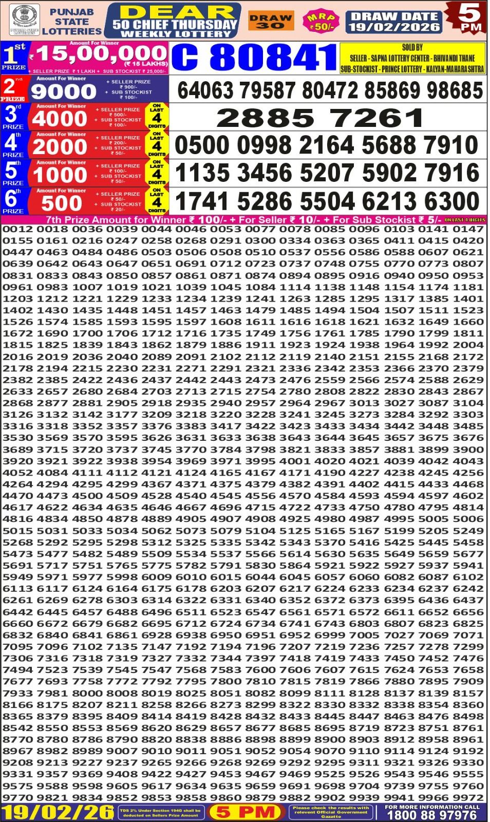 Punjab Dear 50 Chief Lottery Result Today – 5 PM