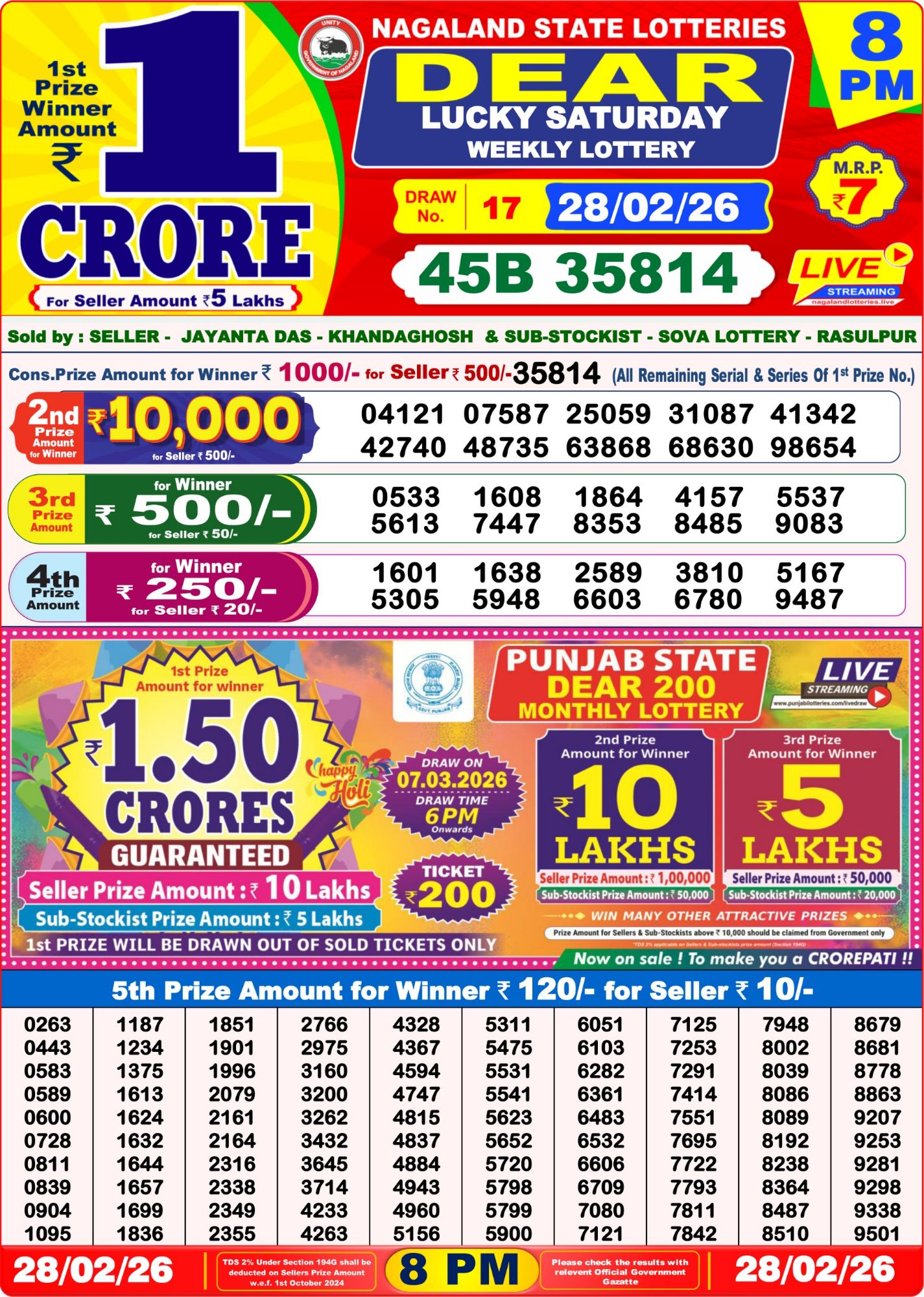 Dear Lucky 8 PM Saturday Weekly Lottery Result 28/02/2026 for Nagaland State Lottery